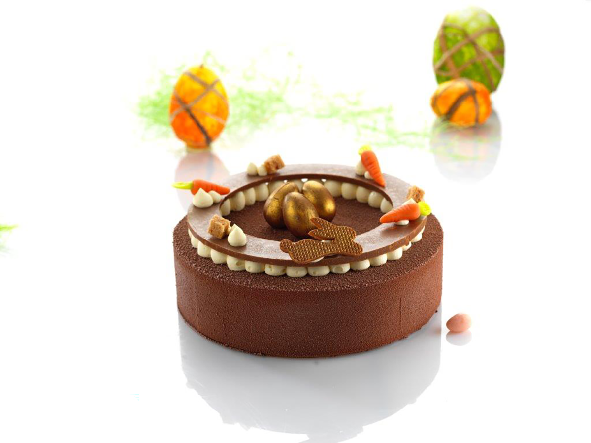 15 - Au centre décorer de petis oeufs réalisés avec le Chocolat Noir 64% et recouvert de poudre d'or, un petit lapin réalisé en pâte sucrée et des petites carottes réalisées avec Pâte d'Amande Décor 22% Blanche, colorée en orange et Pâte d'Amande Décor 22% Verte.